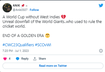 ایک مداح نے لکھا، ’’ورلڈ کپ ویسٹ انڈیز کے بغیر، وہ جنات جو عالمی کرکٹ پر راج کرتے تھے، ان کا زوال شروع ہوگیا ہے۔