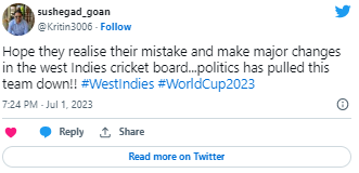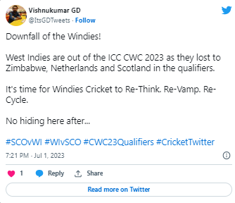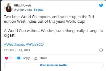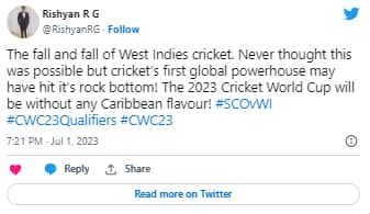 ایک اور مداح نے لکھا، “زمبابوے، سکاٹ لینڈ اور نیدرلینڈز سے شکست کے بعد ویسٹ انڈیز ورلڈ کپ 2023 سے باہر ہو گیا ہے۔ یہ ویسٹ انڈیز کے لیے خود کو بہتر کرنے کا وقت ہے۔