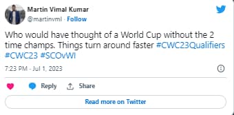 ایک مداح نے لکھا، ’’دو بار کی عالمی چیمپئن ویسٹ انڈیز اس سال ورلڈ کپ سے باہر ہوگئی ہے۔ ویسٹ انڈیز کے بغیر ورلڈ کپ، یہ واقعی عجیب ہے۔