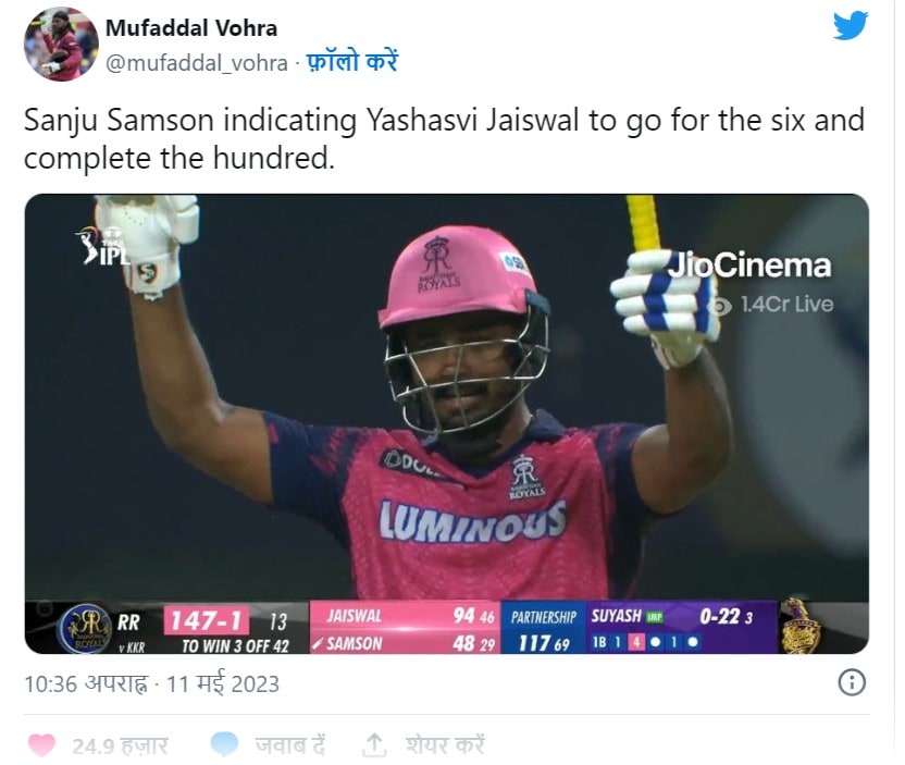راجستھان رائلز کی ٹیم نے بہت تیزی سے اسکور کا تعاقب کیا۔ سنجو سیمسن 13ویں اوور کی آخری گیند پر کریز پر موجود تھے۔ انہوں نے سویاش شرما کی گیند کا دفاع کیا۔ اس وقت راجستھان کو جیت کے لیے 4 رنز درکار تھے۔ سیمسن چاہتے تو چوکا یا چھکا لگا کر میچ جیت سکتے تھے۔ لیکن اس نے ایسا نہیں کیا۔ سیمسن یشسوی جیسوال کو سنچری کا موقع دینا چاہتے تھے۔