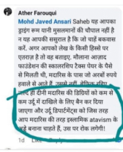 "یہ آپ کا ڈرائنگ روم یعنی مسلمانوں کی چوپال نہیں ہے۔نہ یہ آپ کی سسرال ہے کہ جو چاہیں بکواس کریں۔اگر آپ کو لیکھ کے کسی حصے پر اعتراض ہے تو وہ بتائیے۔مولانا آزاد فاؤنڈیشن کی اسکالر شپ ٹیکس پیئر کے پیسے سے ملتی تھی۔مدارس کے پاس جو اربوں روپے حوالے سے آتے ہیں اس سے نہیں۔بے فکر رہیے جلد ہی دینی مدارس کی ڈگریوں کو کم سے کم اردو میں داخلے کے لیے بین کر دیا جائے گا اور اردو ڈپارٹمنٹس کو جس طرح آپ مدارس کی طرح اسلامک Atavism کے اڈے بنانا چاہتے ہیں اس پر روک لگے گی۔”
